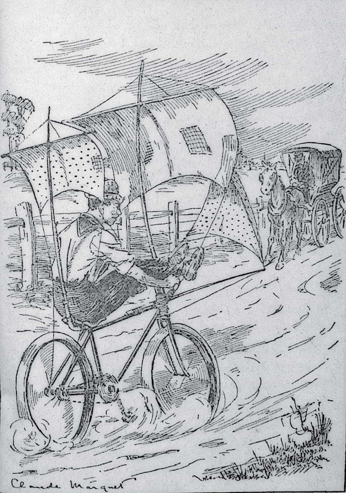 They hadn’t long to wait. The barn door opened wide again and Peter, with the bicycle rigged in full canvas like a sailing boat, appeared.