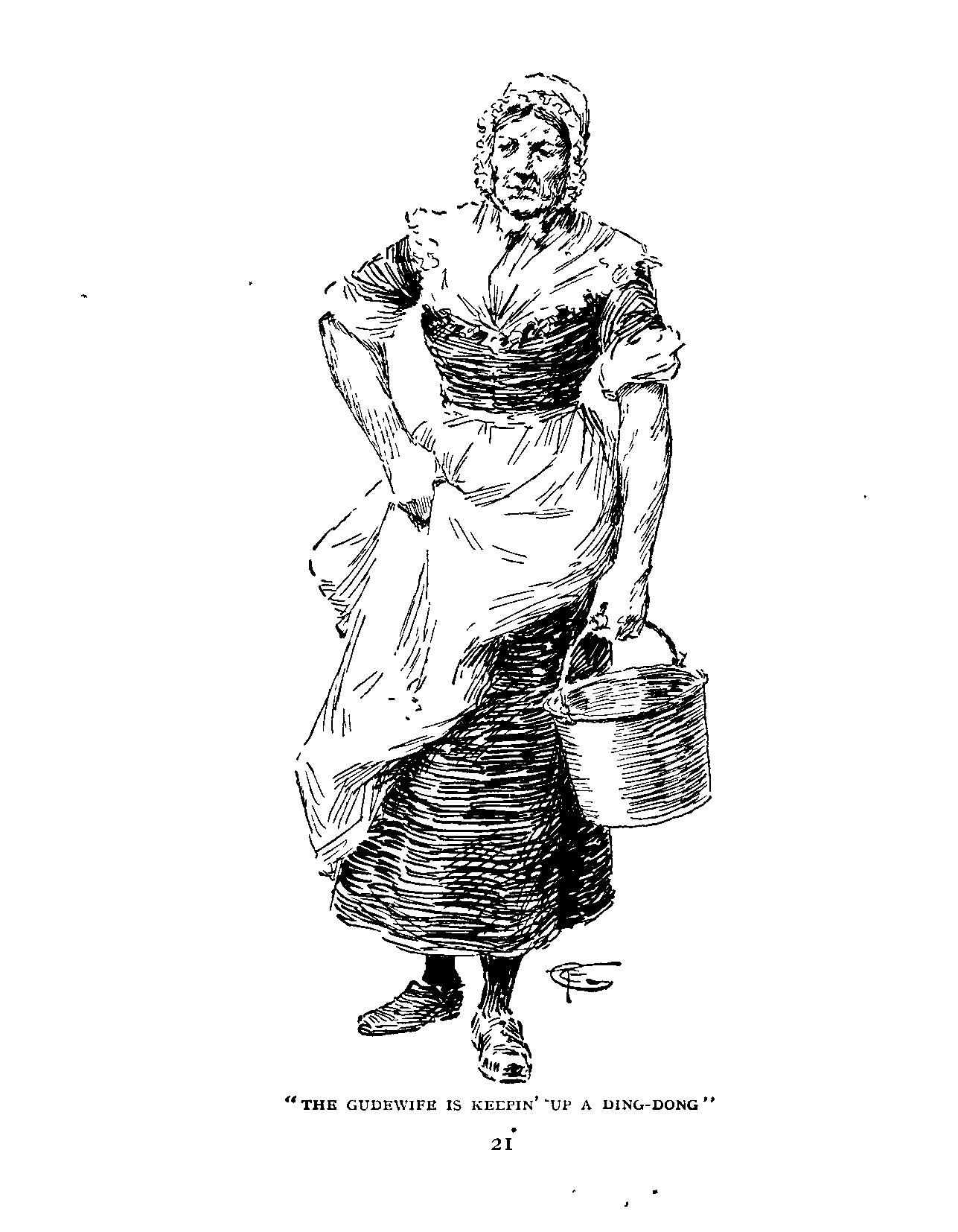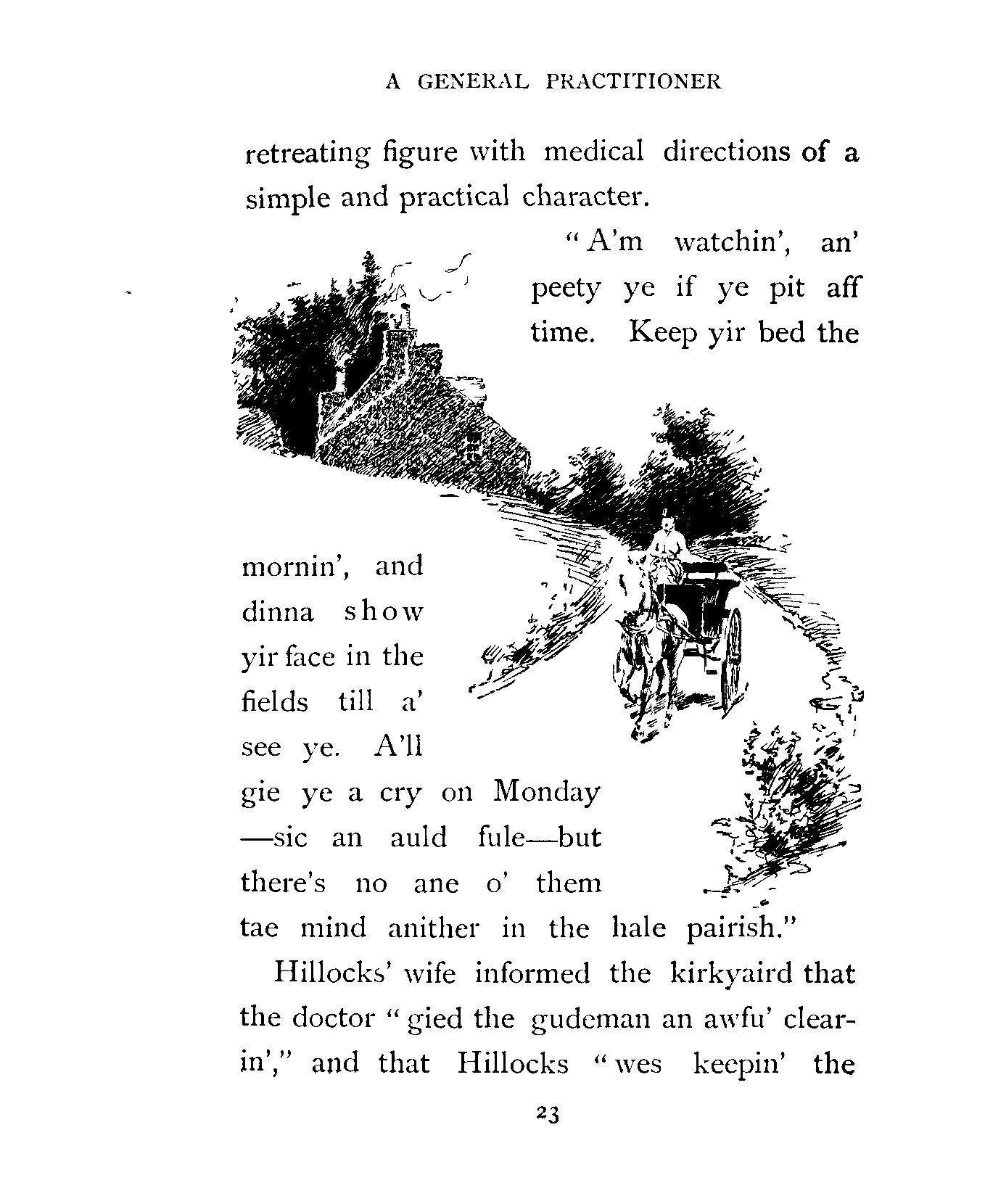 Hillocks' wife informed the kirkyaird that the doctor "gied the gudeman an awfu' clear-in'," and that Hillocks "wes keepin' the hoose," which meant that the patient had tea breakfast, and at that time was wandering about the farm buildings in an easy undress with his head in a plaid.