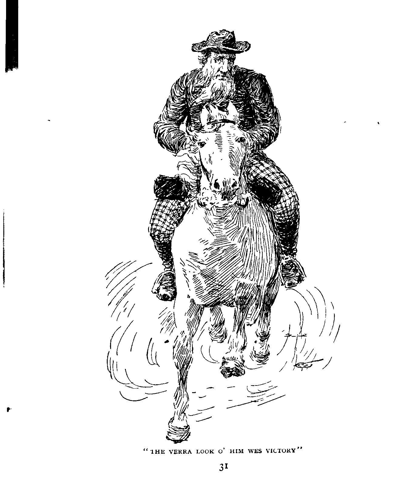 Mr. Hopps earned the ill-will of the Glen for ever by criticising the doctor's dress, but indeed it would have filled any townsman with amazement. Black he wore once a year, on Sacrament Sunday, and, if possible, at a funeral; topcoat or waterproof never. His jacket and waistcoat were rough homespun of Glen Urtach wool, which threw off the wet like a duck's back, and below he was clad in shepherd's tartan trousers, which disappeared into unpolished riding boots. His shirt was grey flannel, and he was uncertain about a collar, but certain as to a tie which he never had, his beard doing instead, and his hat was soft felt of four colors and seven different shapes. His point of distinction in dress was the trousers, and they were the subject of unending speculation.