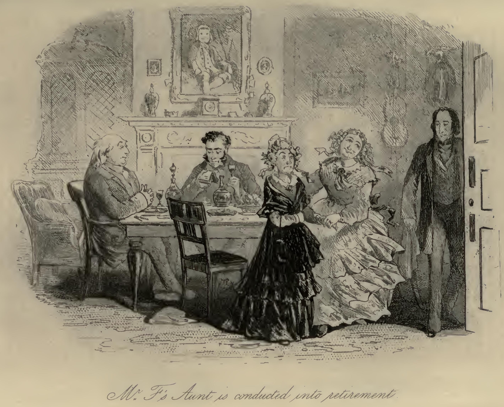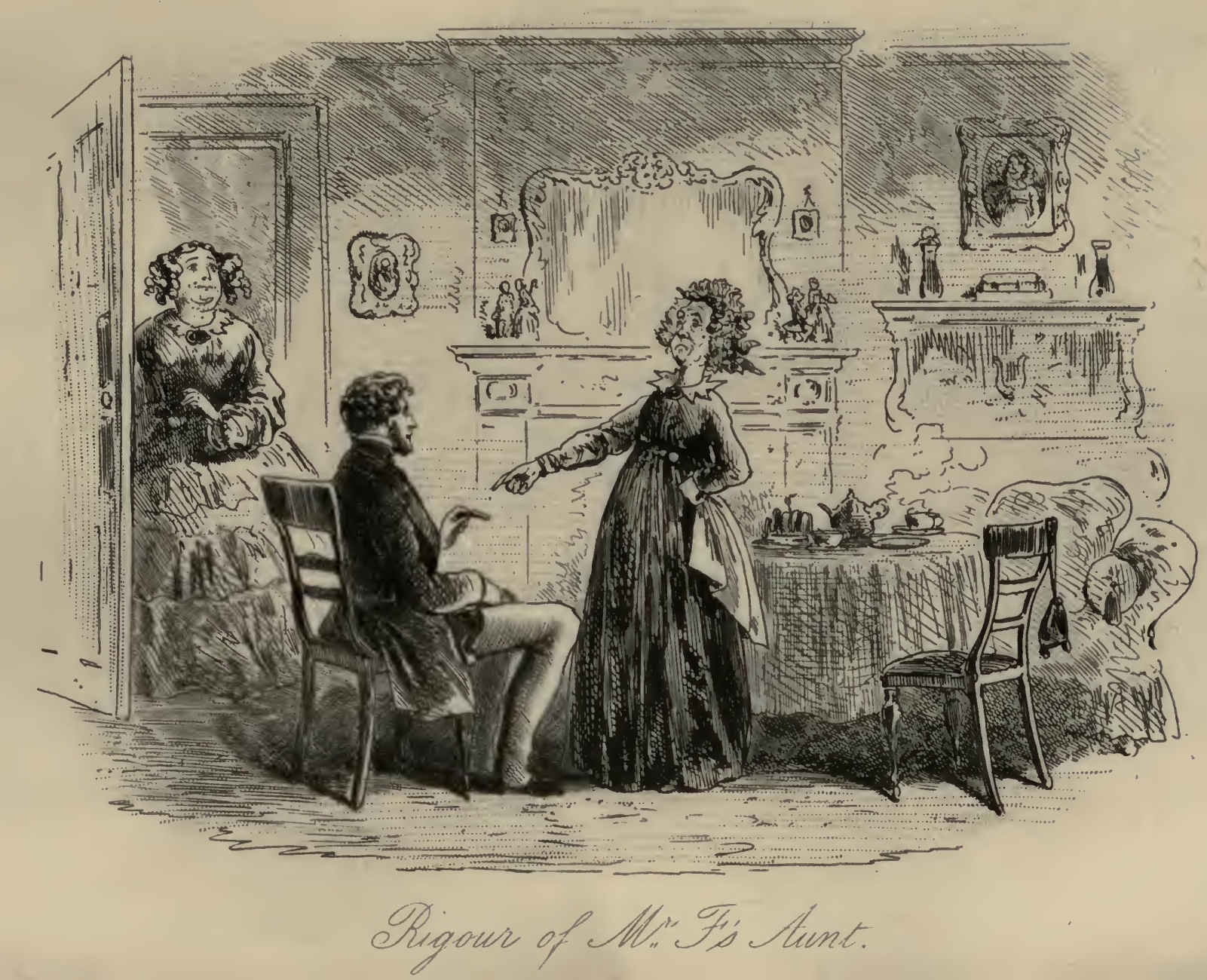 Flora’s eyes were a little red, and she seemed rather out of spirits. Mr F.‘s Aunt was so stiffened that she had the appearance of being past bending by any means short of powerful mechanical pressure. Her bonnet was cocked up behind in a terrific manner; and her stony reticule was as rigid as if it had been petrified by the Gorgon’s head, and had got it at that moment inside. With these imposing attributes, Mr F.‘s Aunt, publicly seated on the steps of the Marshal’s official residence, had been for the two or three hours in question a great boon to the younger inhabitants of the Borough, whose sallies of humour she had considerably flushed herself by resenting at the point of her umbrella, from time to time.